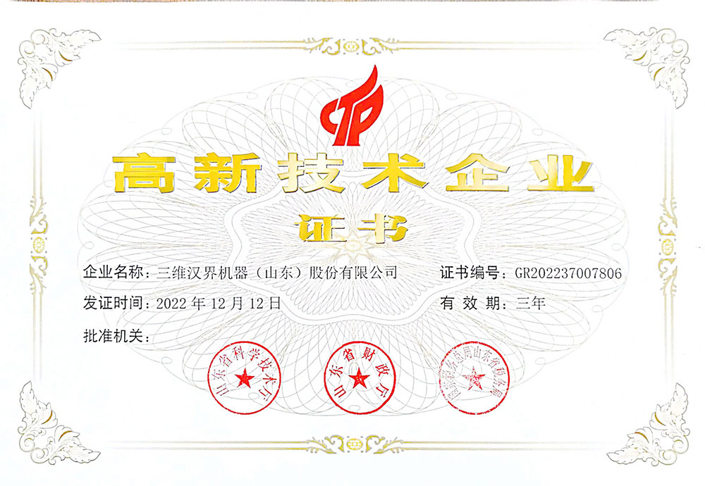 三維漢界機器(山東)股份有限公司 國家高新技術企業(yè),具有自主知識產(chǎn)權并獲得多項國家發(fā)明專利!【全自動噸袋包裝機、全自動裝車機、自動碼垛、AGV智能立體庫】